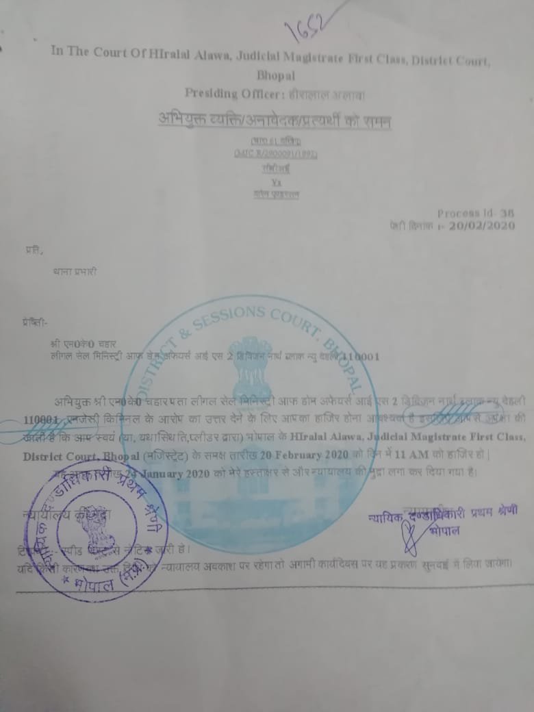 The first class magistrate of Bhopal District Court (Heeralal Alawa) issued summons to Under Secretary, Legal Cell-IS II Division, Ministry of Home Affairs, Govt of India to present itself on 20 February 2020 and explain why it has not been able the serve the summons to The Dow Chemical Company under the Mutual Legal Assistance Treaty since 2014. This summons to MHA has also been issued on the application of Bhopal Group for Information & Action (BGIA)