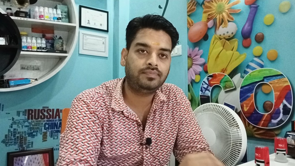 Aman Kumar, 33, runs a digital printing press and happily pays Rs 1,100 a month for electricity from Husk Power Systems mini solar grid in the Jagannath Basant village in the Lalganj region in Patna. Photo by Shuchita Jha.